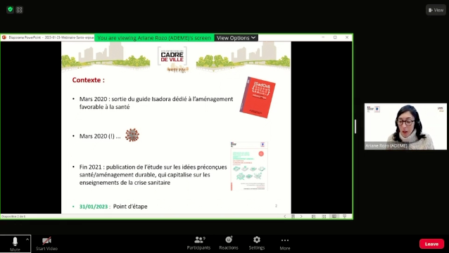 Webinaire organisé par Cadre de Ville et l’Ademe pour présenter l’étude « Dépasser les idées préconçues entre santé et aménagement urbain : les clefs de l’urbanisme durable », menée avec AIA Environnement, afin d’exposer les liens entre aménagement urbain et santé.