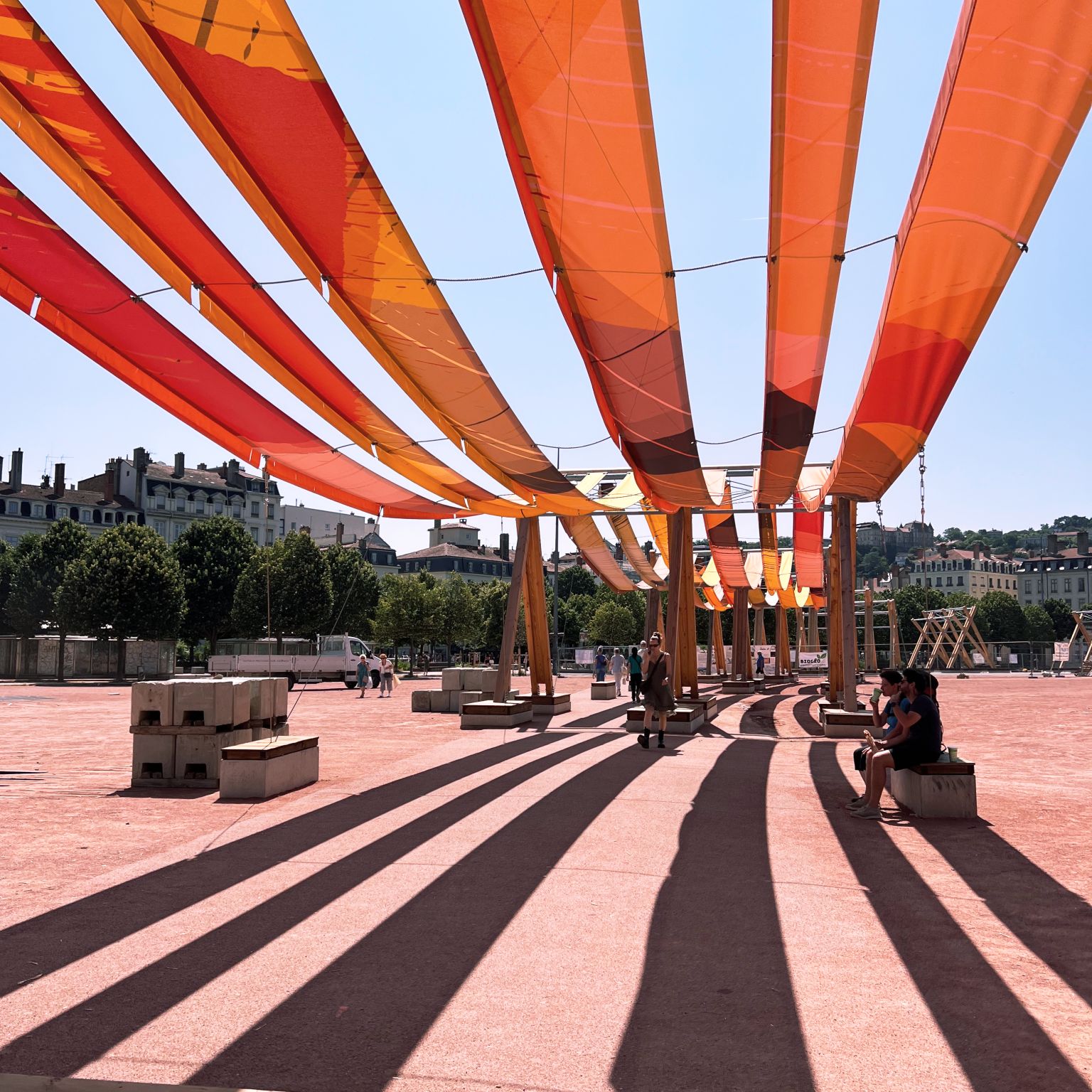 Inspired by the canuts of Lyon, the artwork Urban Weaving combines wooden structures with suspended drapes to create a shaded, refreshing pathway on a listed heritage site, while respecting its historic character. A new page in history!