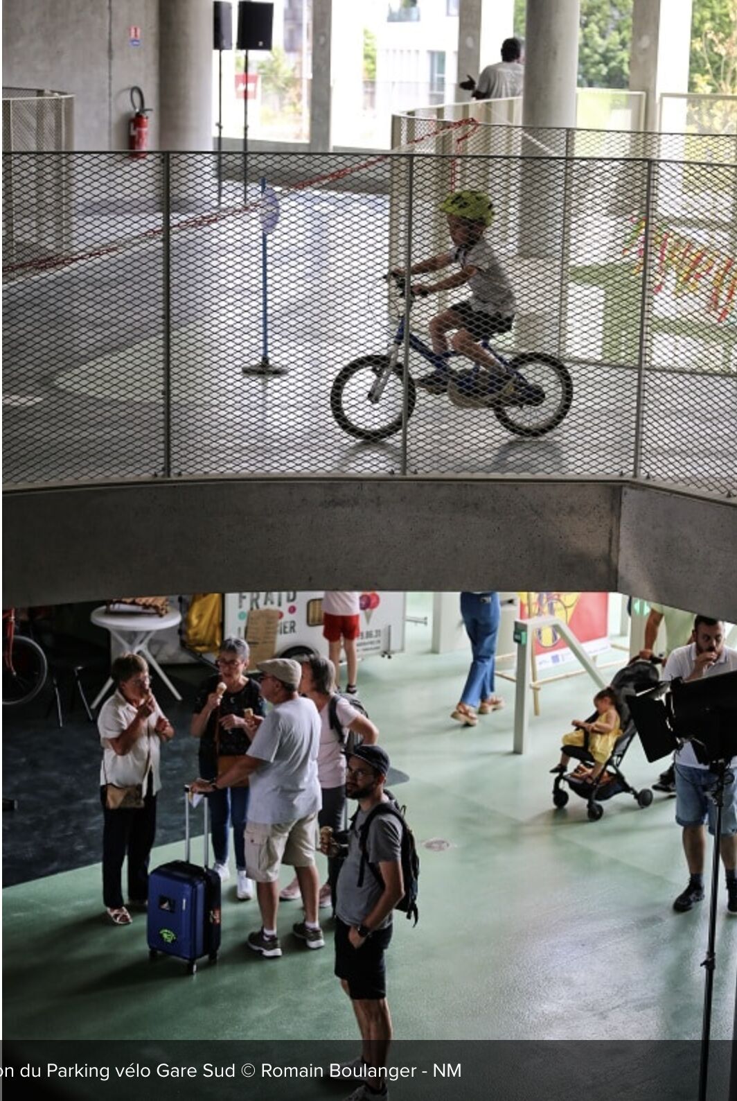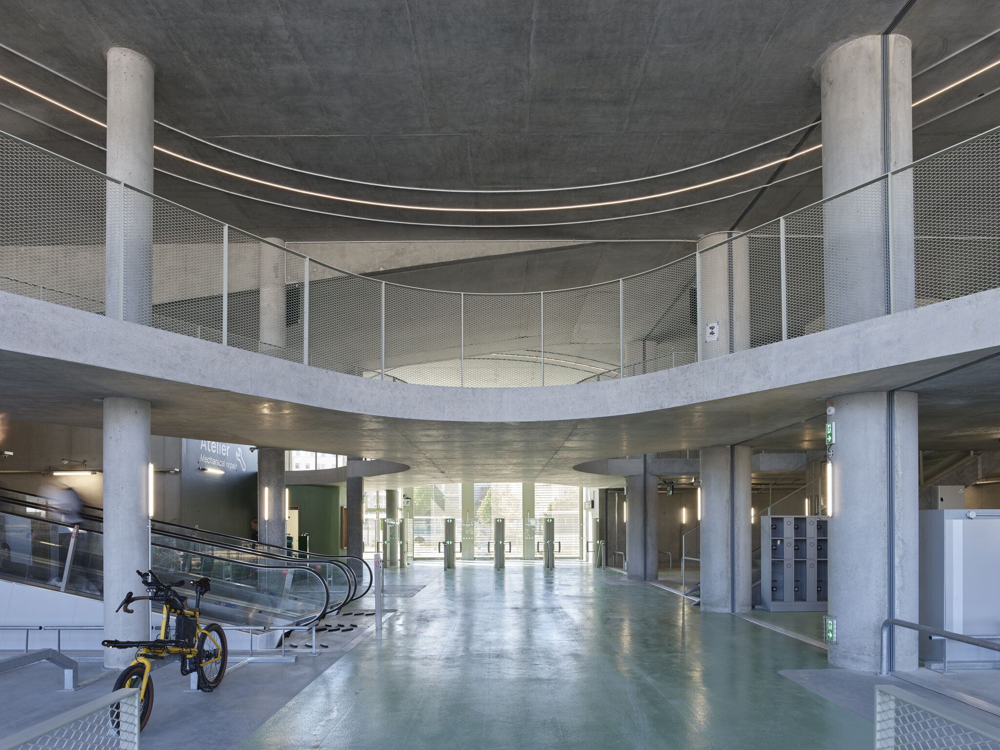 With its 1,216 new spaces, the South Station bike park strengthens an already substantial offer around the station, bringing the total to over 2,400 bicycle parking spots. Designed for all types of users: standard bikes, cargo bikes, longtails, e-bikes, and PRM access. The facility also includes secure lockers, charging points, and a maintenance area.