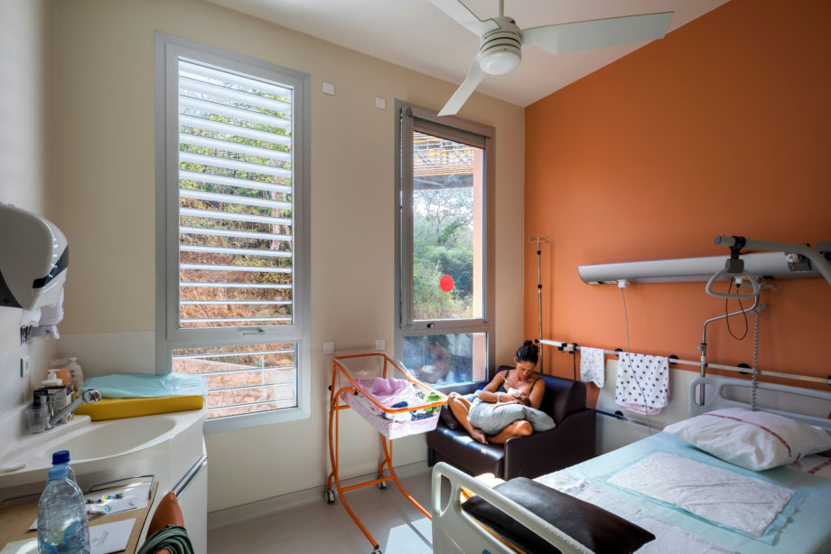 Inédit à ce jour pour un établissement hospitalier, la conception bioclimatique permet de réduire la durée de climatisation active à quatre mois dans l’année. L’air traverse le projet grâce à son positionnement Est / Ouest, dans le sens des vents dominants, et grâce à un dispositif de patios et de coulées végétalisées savamment disposés, en collaboration avec les experts de la soufflerie Eiffel et Jacques Gandemer. Les énergies renouvelables sont valorisées avec la mise en place de capteurs solaires thermiques installés sur la toiture qui produisent de l’eau chaude sanitaire. Le projet paysager, composé d’essences locales peu gourmandes en eau, intègre les fonctions de gestion alternative des eaux pluviales et de renforcement de la biodiversité. L’impact environnemental et sanitaire des matériaux est réduit pour l’ensemble des revêtements intérieurs et des peintures.